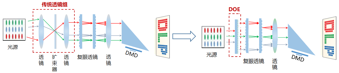 ⚫ 结构更紧凑:一片DOE元件集合束、匀光、扩束多种功能,光学结构更紧凑、更薄、更轻便 ⚫ 光斑更均匀:减少光源干涉和边缘衍射,可以一定程度上抑制散斑,光斑更均匀 ⚫ 能效更高效:减少光学元件,光损更低,能量利用率更高