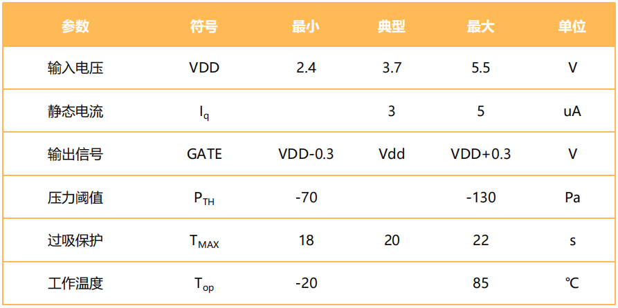 MAFS01A-2718-DB1 采用2.75mm×1.85mm封装,体积小、可过回流焊,满足 SMT 贴片作业实现高效率自动化生产。适用于需要检测气压微压差的设备中,比 如:电子烟等便携式设备。当内置MEMS 传感芯片感应到气压变化时,MEMS 传 感芯片将气压变化量转换为电容变化量。MEMS 传感芯片与内置的ASIC 芯片输入 端相连,ASIC 输入端电路通过检测MEMS传感芯片的电容变化量来判断用户操作 行为,并输出相应高低电平信号。采用ASIC 设计,不会有MCU 方案的死机现象, 也不会出现因低于临界电压而引起的芯片无法复位现象。省电模式下静态电流< 5uA,外围应用电路简单。