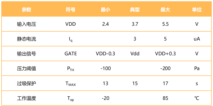 MAFS01A-2718-DA1采用2.75mm×1.85mm封装,体积小、可过回流焊,满足SMT 贴片作业实现高效率自动化生产。适用于需要检测气压微压差的设备中,比如:电子烟等便携式设备。当内置MEMS 传感芯片感应到气压变化时,MEMS 传感芯片将气压变化量转换为电容变化量。MEMS 传感芯片与内置的ASIC 芯片输入端相连,ASIC 输入端电路通过检测MEMS传感芯片的电容变化量来判断用户操作行为,并输出相应高低电平信号。采用ASIC 设计,不会有MCU 方案的死机现象,也不会出现因低于临界电压而引起的芯片无法复位现象。省电模式下静态电流<5uA,外围应用电路简单。