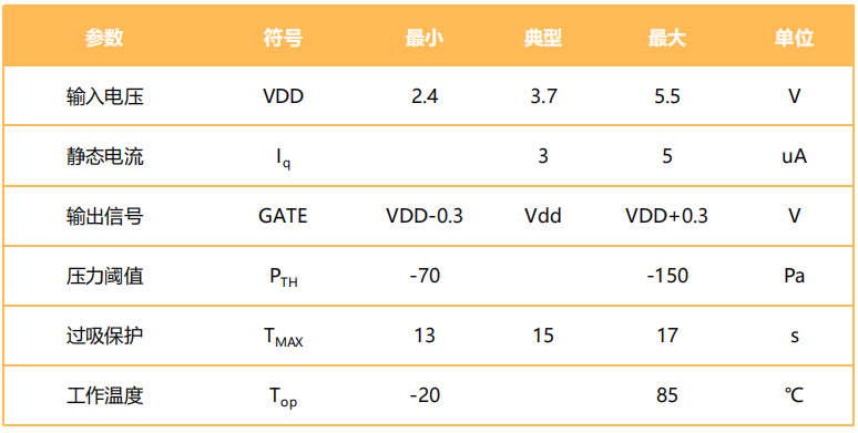 MAFS01A-2718-DA13 采用2.75mm×1.85mm封装,体积小、可过回流焊,满足SMT 贴片作业实现高效率自动化生产。适用于需要检测气压微压差的设备中,比如:电子烟等便携式设备。当内置MEMS 传感芯片感应到气压变化时,MEMS 传感芯片将气压变化量转换为电容变化量。MEMS 传感芯片与内置的ASIC 芯片输入端相连,ASIC 输入端电路通过检测MEMS传感芯片的电容变化量来判断用户操作行为,并输出相应高低电平信号。采用ASIC 设计,不会有MCU 方案的死机现象,也不会出现因低于临界电压而引起的芯片无法复位现象。省电模式下静态电流<5uA,外围应用电路简单。